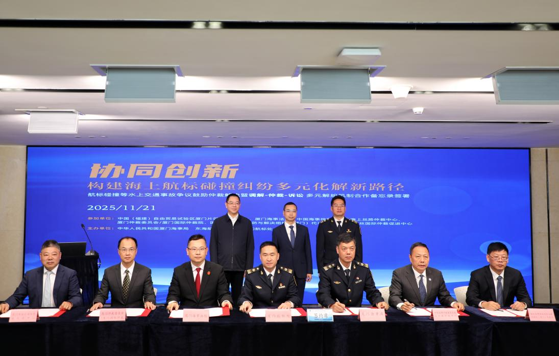 Xiamen, November 21, 2025 — Seven entities including Xiamen Aids to Navigation Department of Eastern Navigation Service Center, Maritime Safety Administration, Xiamen Maritime Safety Administration, Xiamen Maritime Court, and the Xiamen Representative Office of the International Commercial Dispute Prevention and Settlement Organization (ICDPASO) successfully signed the Memorandum of Cooperation on Encouraging Arbitration for Aids to Navigation Collision and Other Marine Accident Disputes & the “Mediation-Arbitration-Litigation” Diversified Resolution Mechanism in Xiamen Free Trade Zone. Mr. WU Shaoying, Senior Consultant of the ICDPASO (Xiamen) Representative Office, attended the signing ceremony.